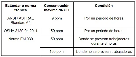Para la ASHRAE (American Society of Heating, Refrigerating and Air-Conditioning Engineers) la concentración recomendada de monóxido de carbono, para un recinto que será ocupado por personas por un periodo de 8 horas, debe ser de 9 ppm (partes por millón). Por otro lado, para la OSHA (Occupational Safety and Health Administration de EEUU) la máxima concentración admisible, para lugares con trabajadores expuestos por un periodo de 8 horas, es de 50 ppm.